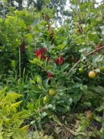 De tuin, ca. 2000 m², heeft als basis een gelaagde bosranden, namelijk een rij fruitbomen, ernaast een rij bessenstruiken en vaste planten zoals groene asperges.